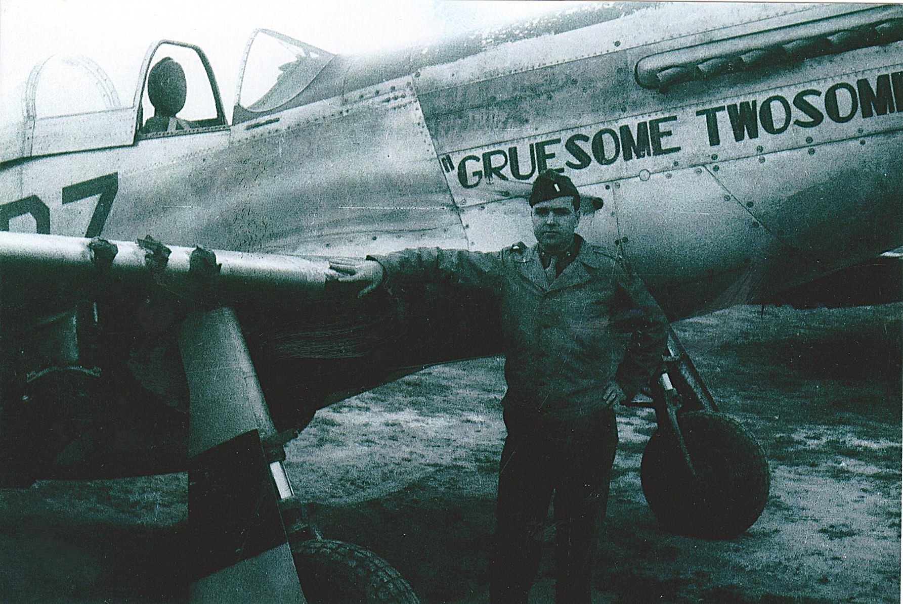 Lt John McDonald with P-51, 44-13965, D7-Z/ "Gruesome Twosome" A war-weary P-51D converted into a two-seater by 339th FG crews by removal of the fuselage tank and fitting a rear seat. The 339th Fighter Group's base was Fowlmere, England (8 mi. SSW of Cambridge).
