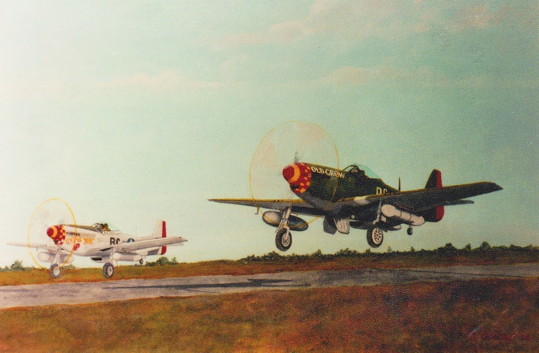 Merle Olmsted painting of P-51D Old Crow taking off with Lt Joe Cannon in P-51D, Little Joe, B6-B, 44-13887.