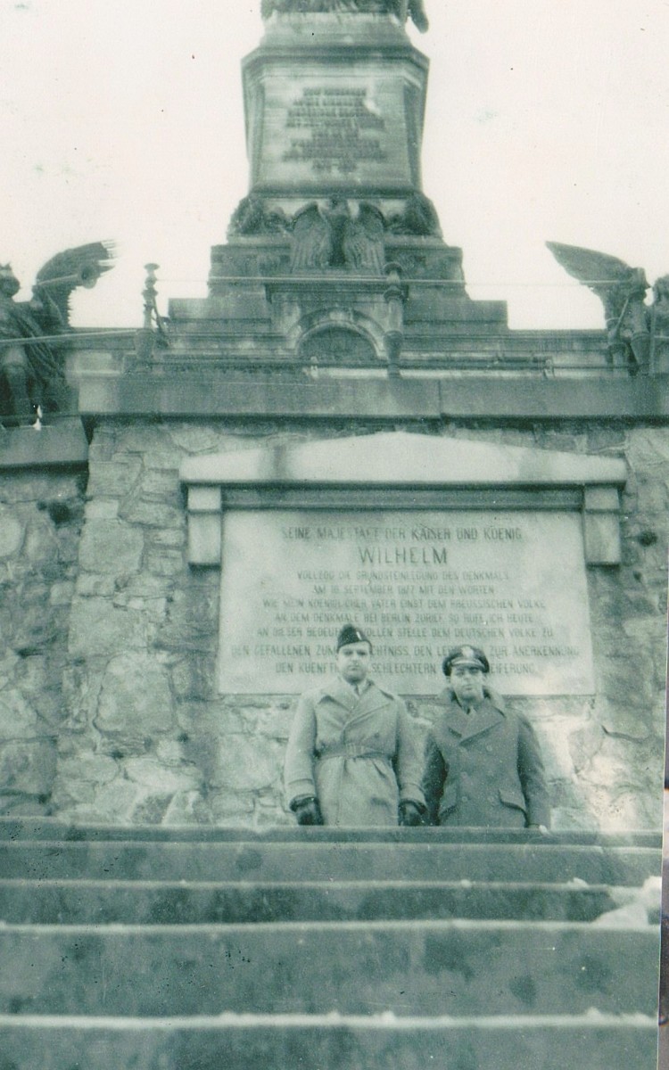 Lt McDonald and Lt Taylor at Niederwald monument near Ruedesheim, Germany, beside the Rhine River . The monument was to commemorate the unification of Germany in 1871.