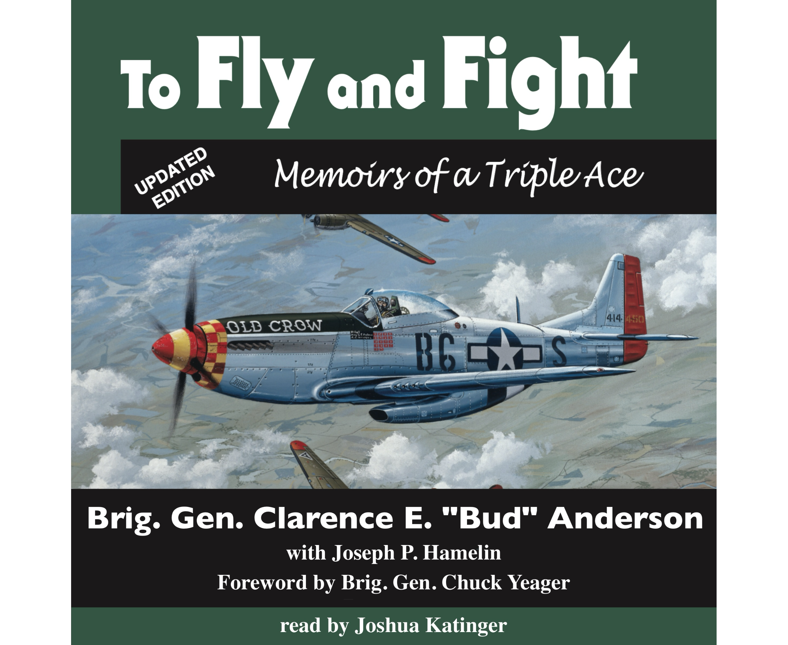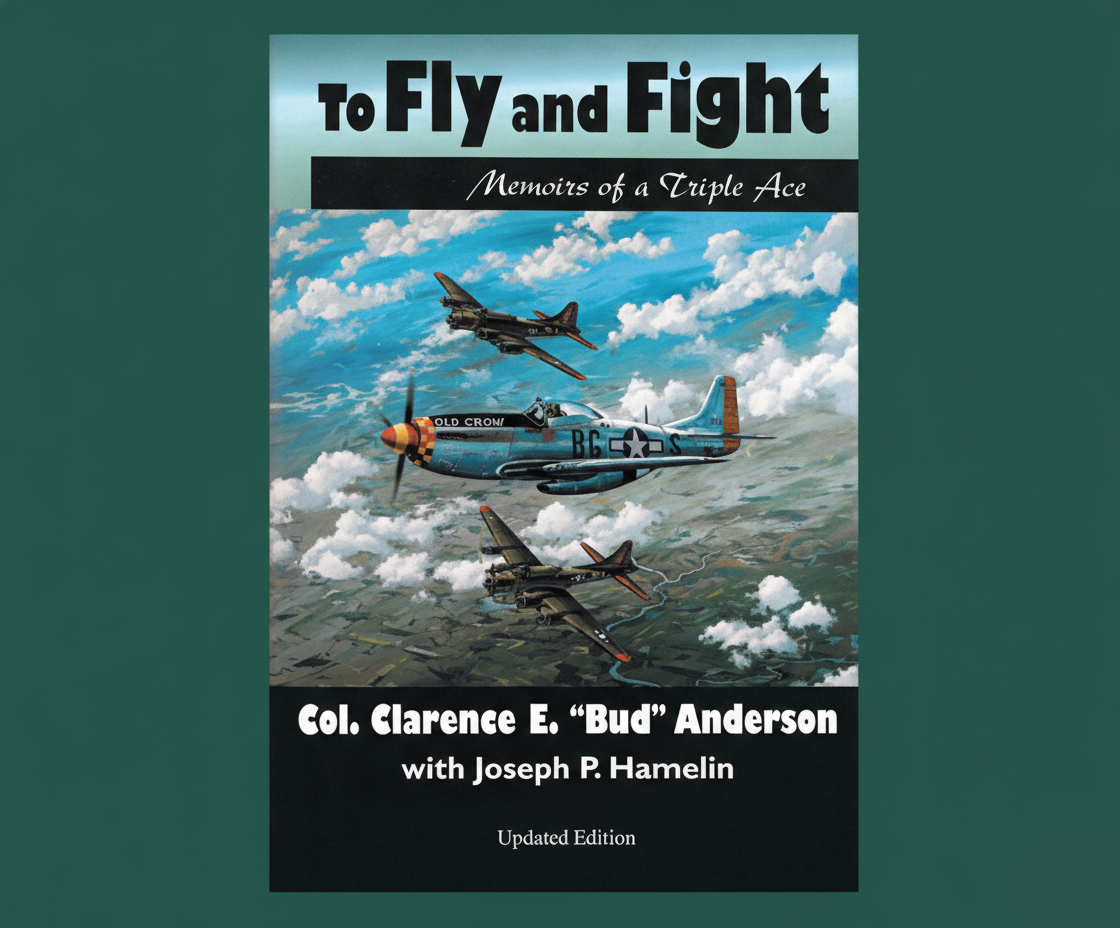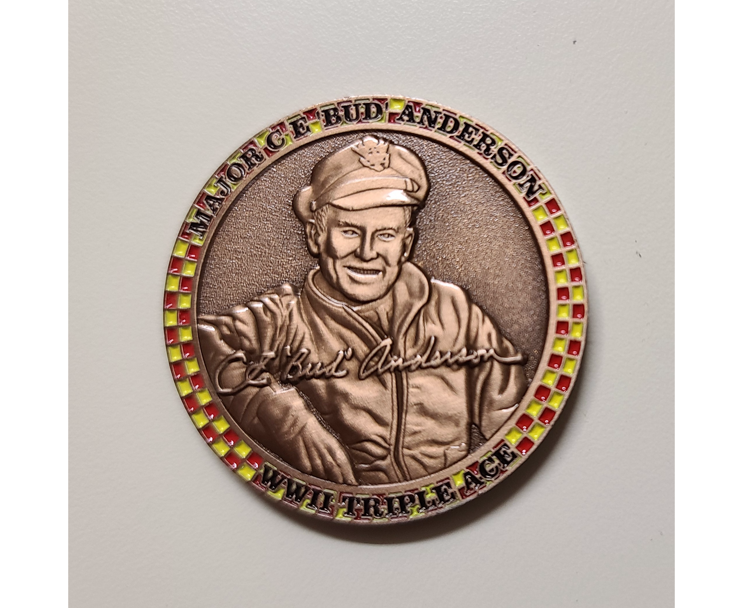 Bud Anderson’s personal commemorative coin, in the military challenge coin tradition. Approximately 1.5″ in diameter and made of solid brass, the coin features the image of Bud Anderson at the conclusion of his final tour in WWII. The opposite side features the image of his legendary Old Crow P-51 Mustang of the 357th Fighter Group.