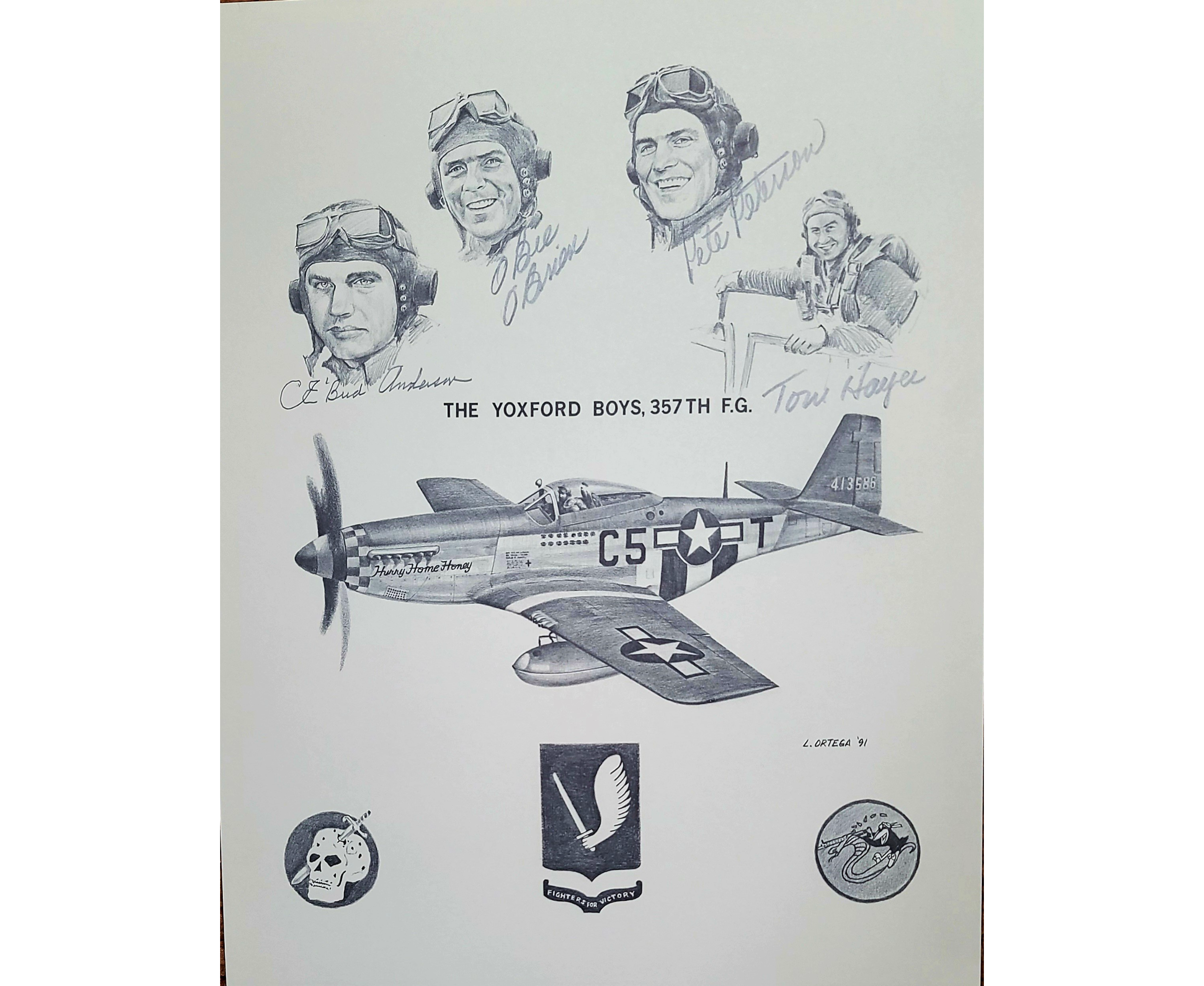 Print size 11″ X 14″ showing four 357th FG Aces – CE ‘Bud’ Anderson 16.25 Victories, OBee O’Brien 5.5 Victories, Richard ‘Pete’ Peterson 15.5 Victories and Tommy Hayes 8.5 Victories. Print is signed by all four Aces and artist Lonnie Ortega.