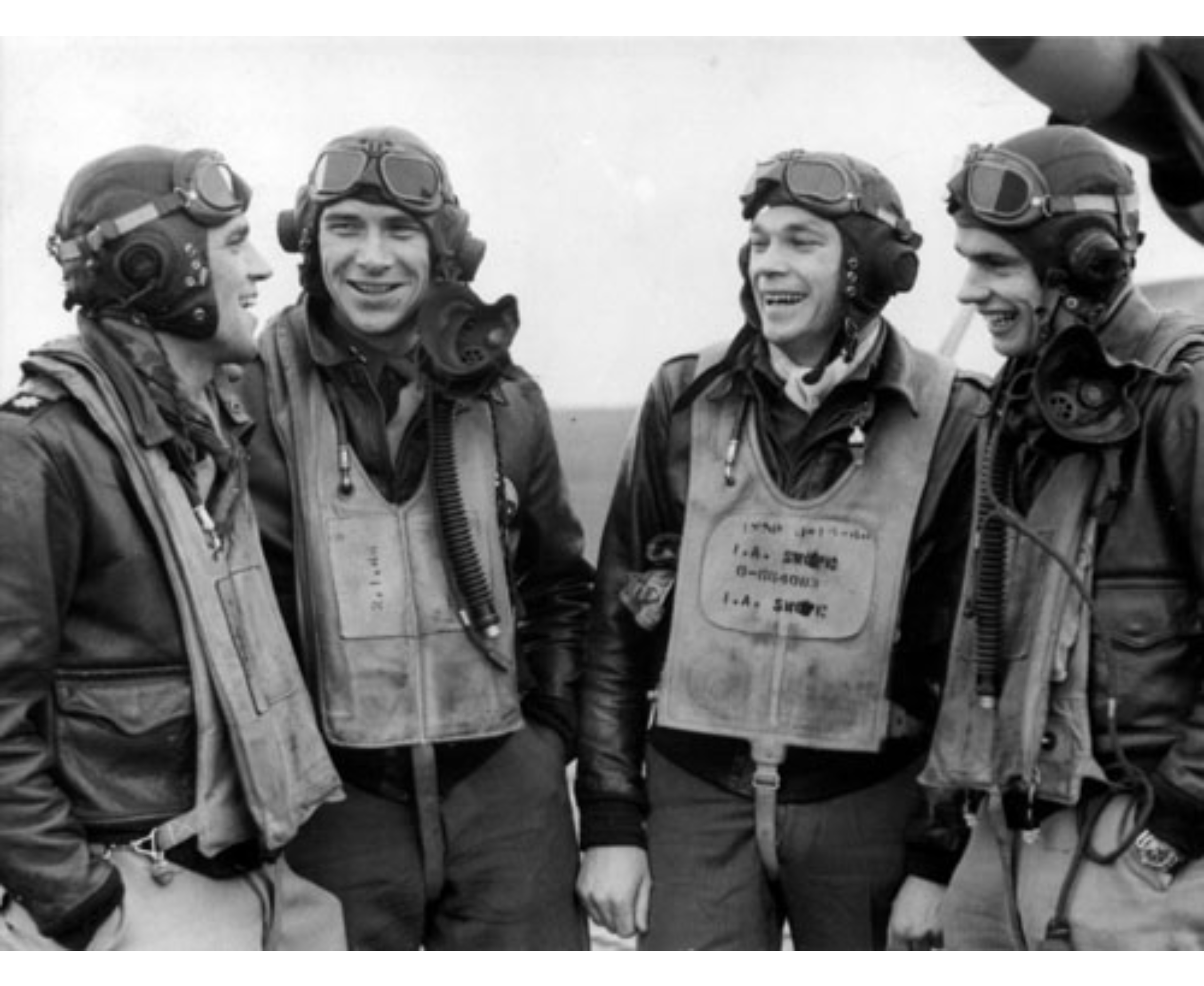 WWII Photo of the “Top Guns” of the 357th FG “Yoxford Boys.” (L-R) Richard A. “Pete” Peterson, 15 1/2 victories, Leonard K. “Kit” Carson, 18 1/2 victories, John B. England, 17 1/2 victories, and Clarence E. “Bud” Anderson, 16 1/4 victories. Photo is signed by Bud.